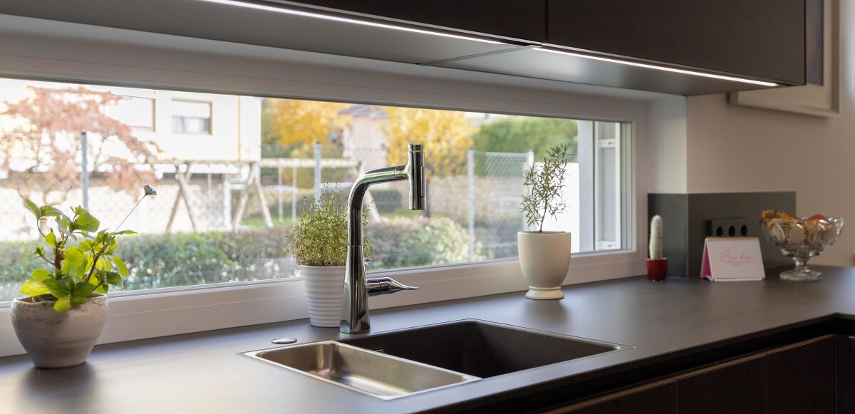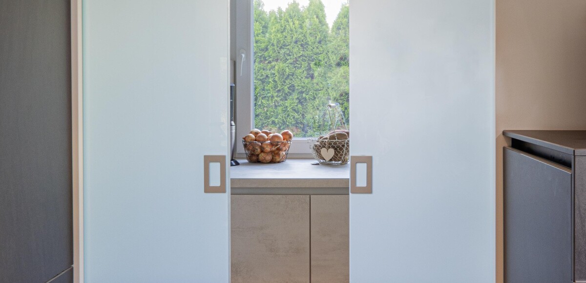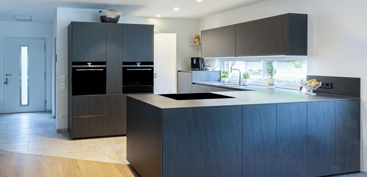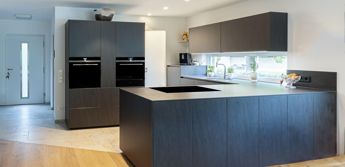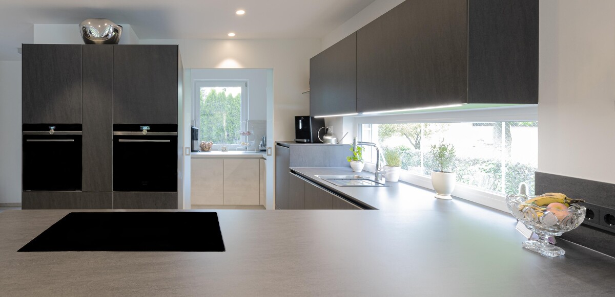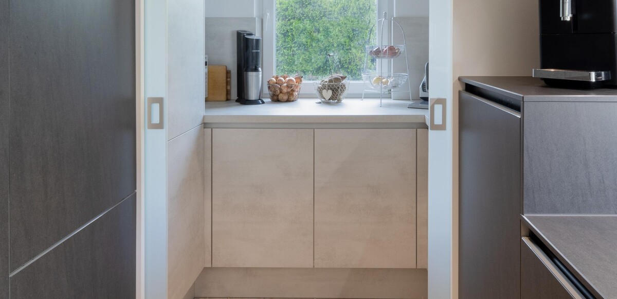 Gemeinsam mit unserem Partner Next125 bieten wir wunderschöne Designerküchen: Hier sind die Fronten sowie die Arbeitsplatte aus derselben Keramik gefertigt, und hinter der Glasschiebetüre befindet sich noch eine kleine Butler's-Kitchen, so der englische Ausdruck für eine kleine Küche, in der man das Zubereiten und Kochen der Speisen vorbereiten kann.