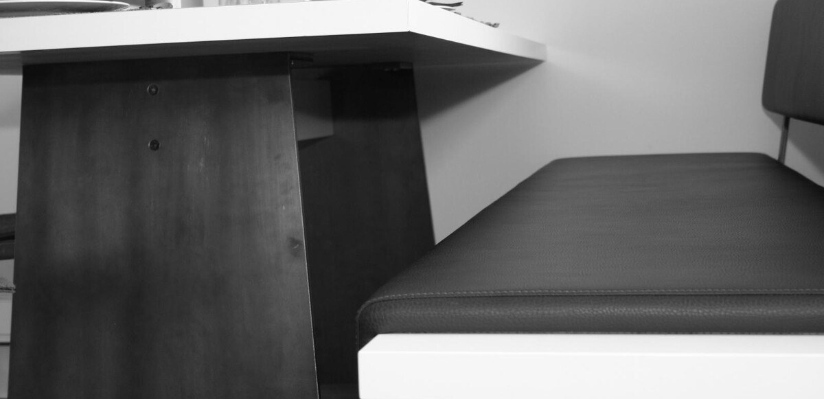 Hier sehen Sie eine sehr moderne Landhausküche mit integriertem Essbereich.