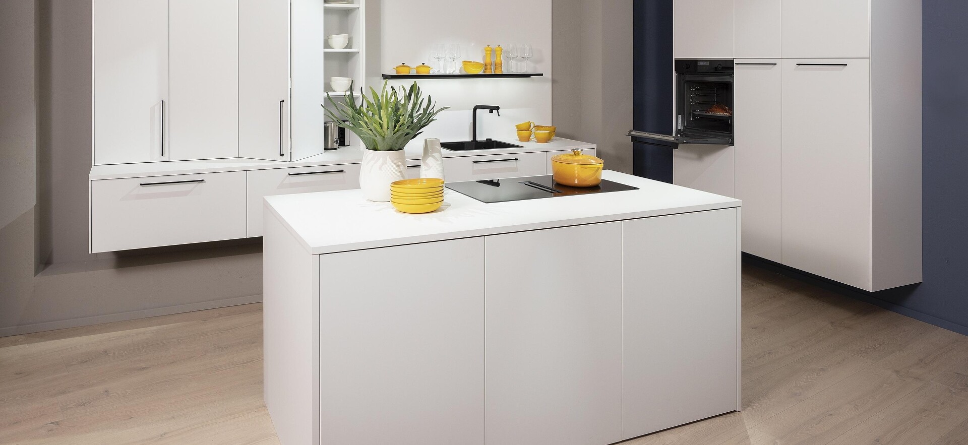 Ein neuer Trend: Erst waren es Unterschrankzeilen, die wandhängend montiert wurden. Inzwischen ist es möglich, ganze Küchen- und Gerätehochschränke ohne Sockel stabil in der Wand zu verschrauben, sodass sie hoch über dem Küchenboden hängen. Diese aus der Badplanung inspirierte Gestaltung verleiht Küchen eine elegante, minimalistische Anmutung und sorgt zugleich für eine optische Vergrößerung des Raums, da mehr Bodenfläche sichtbar bleibt.