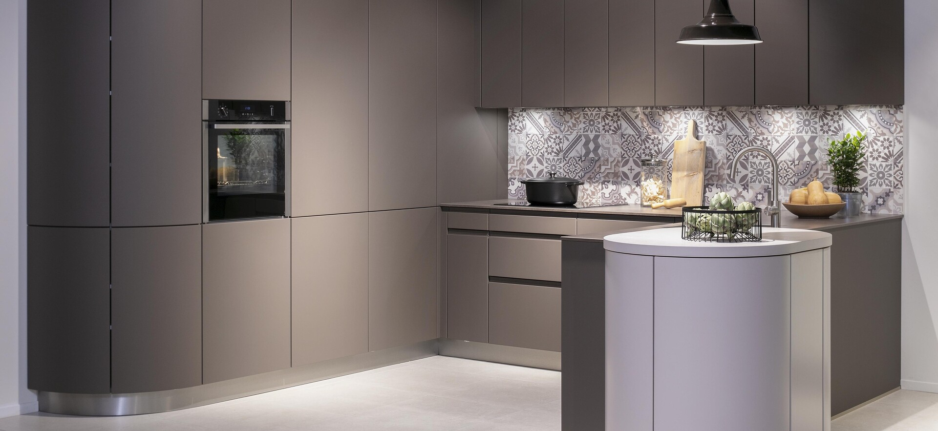 Das matte Havannabraun sieht in Kombination mit silbernen Sockelleisten und dem magnoliaweißen Abschlussschrank erst recht edel aus – schön angestrahlt von der schwarzen Retro-Hängelampe. Der helle glatte Fliesenboden und die blaue Zimmerdecke vollenden die Farbgestaltung. Auch die grifflose Ausführung passt perfekt zu diesem Design und ist zusätzlich besonders pflegeleicht. Sämtliche Küchenschränke öffnen sich nach leichtem Druck mit Knie, Hand oder Ellenbogen.