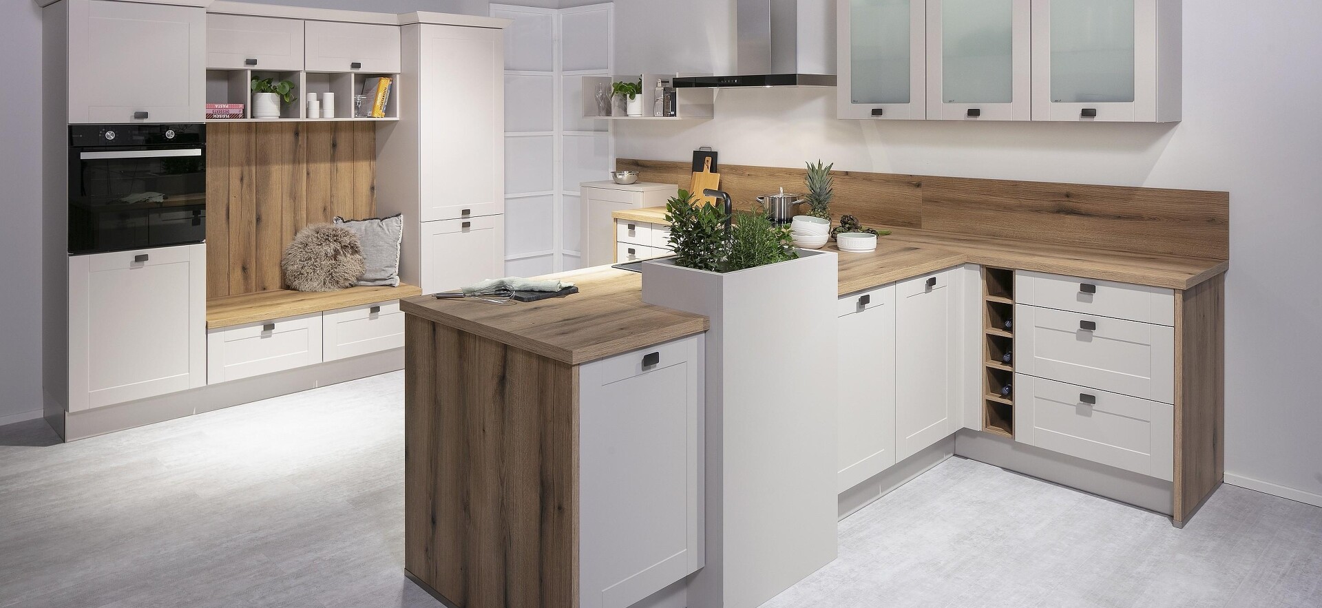 Hochbeet in der Küche? – Warum nicht! Unser Küchenbeispiel zeigt, wie schön so eine Pflanzensäule zur Küchengestaltung beiträgt. Der skulpturale Charakter lockert auf und gliedert zugleich die Theke angenehm auf. Zur Küche hin sind frische Kräuter damit immer griffbereit. Zur Wohnseite hin sorgt das natürliche Grün für Wohlfühlatmosphäre.